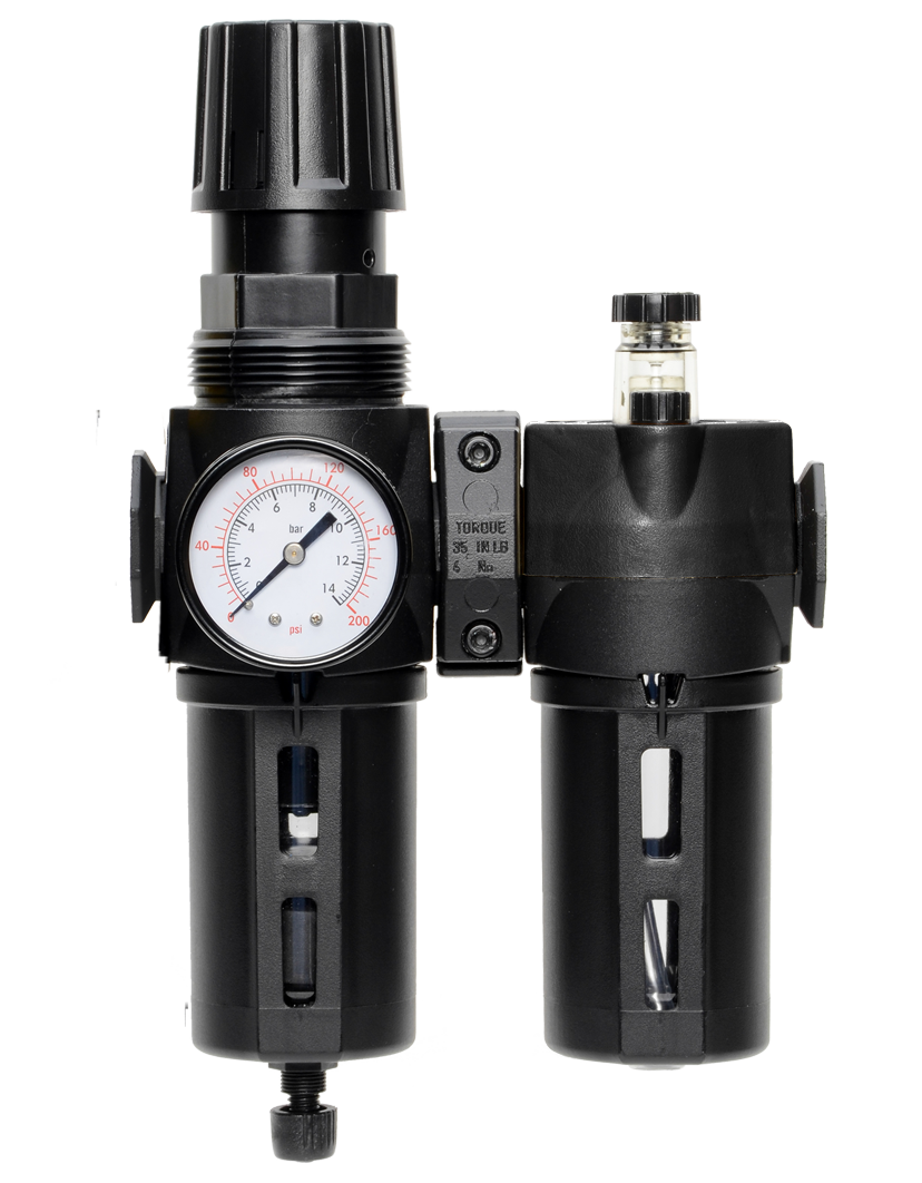 - Filter and regulator consolidated in a single assembly, sight-feed lubricator